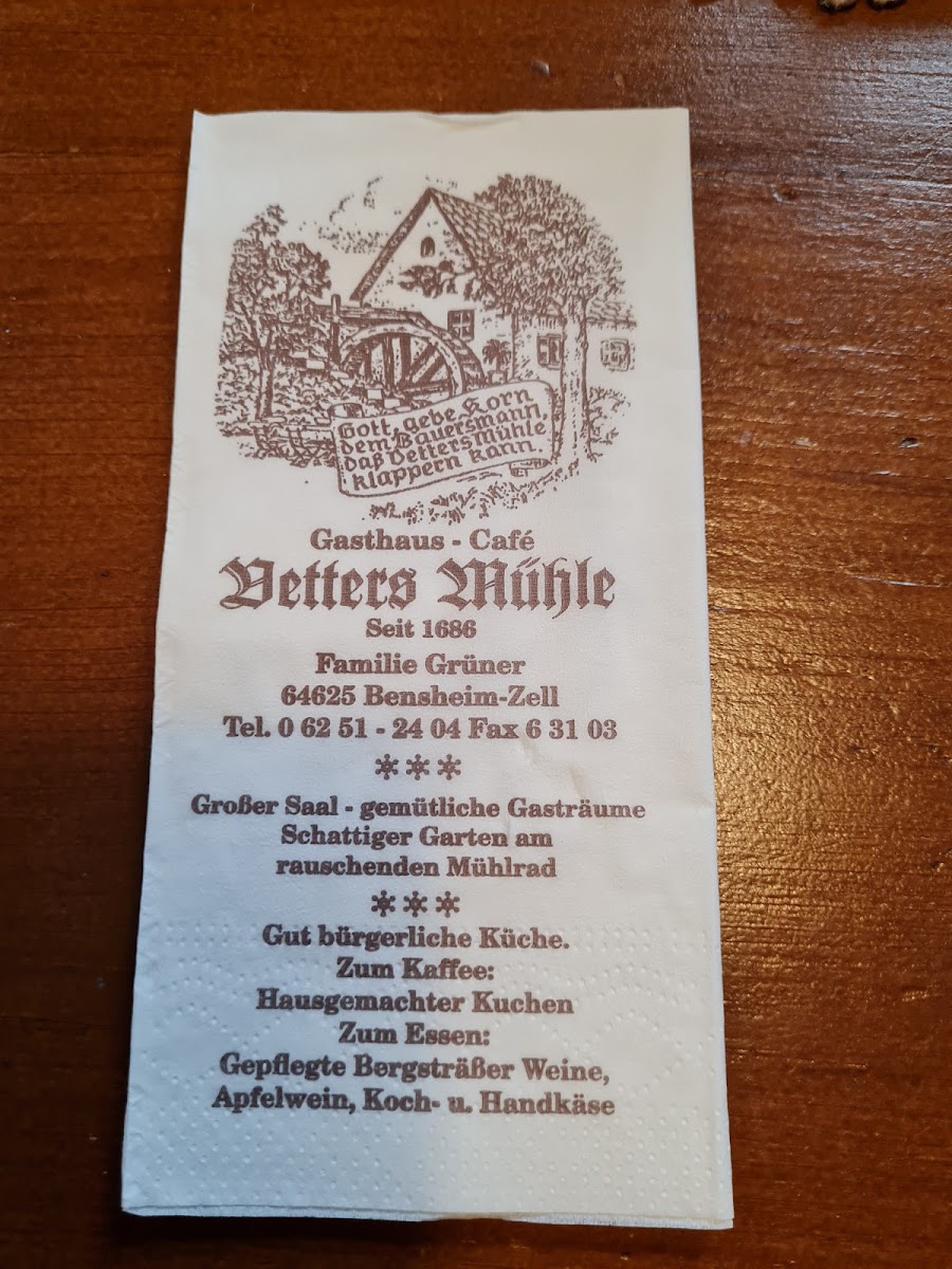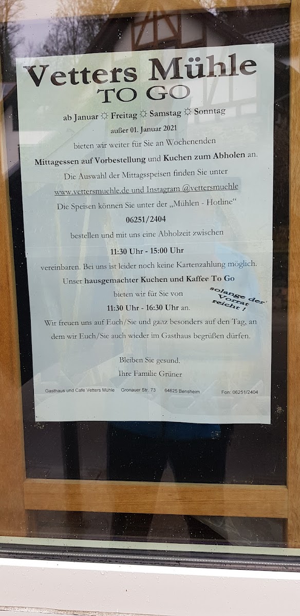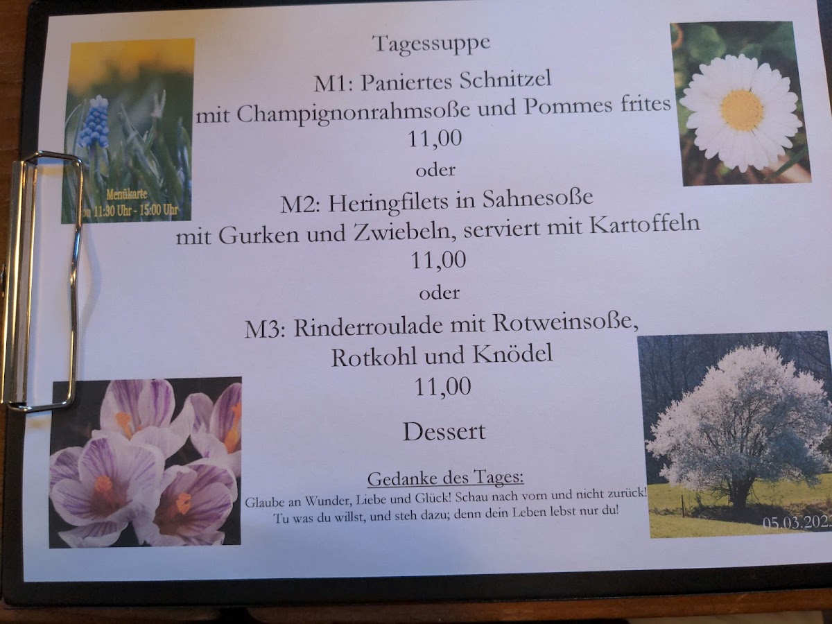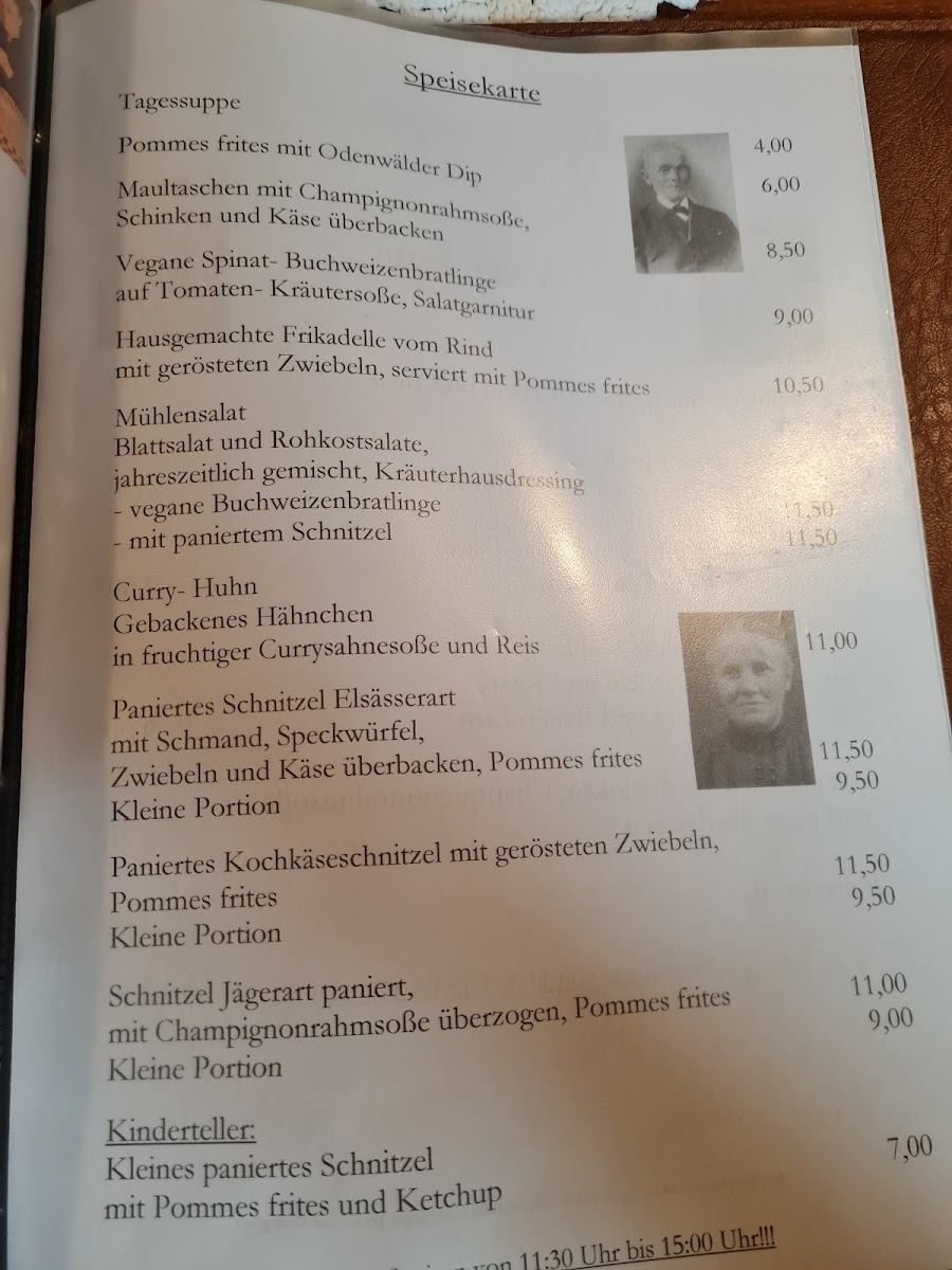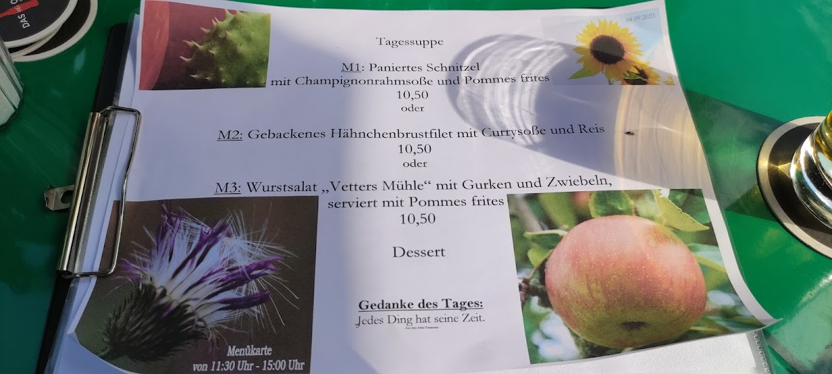 The menu at Vetters Mühle offers a range of traditional and regional dishes suitable for various dining occasions, including breakfast, lunch, and coffee breaks. The selection features classic café items alongside hearty meal options and desserts.